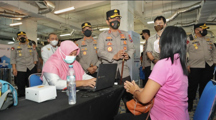 Aksesnusantara.id, Surabaya – Kapolda Jawa Timur Irjen Pol Nico Afinta bersama Kasiter Korem 084/BJ Kolonel Kav Jaelani yang berkesempatan mewakili Danrem 084/BJ dan Kadinkes Kota Surabaya Ibu Nanik serta Kapolrestabes Surabaya Kombes Pol Ahmad Yusep dan pejabat utama Polda Jatim Rabu (16/2/2022) siang, mengecek pelaksanaan Vaksinasi dosis ketiga atau Booster di Grand City Mall, Surabaya.