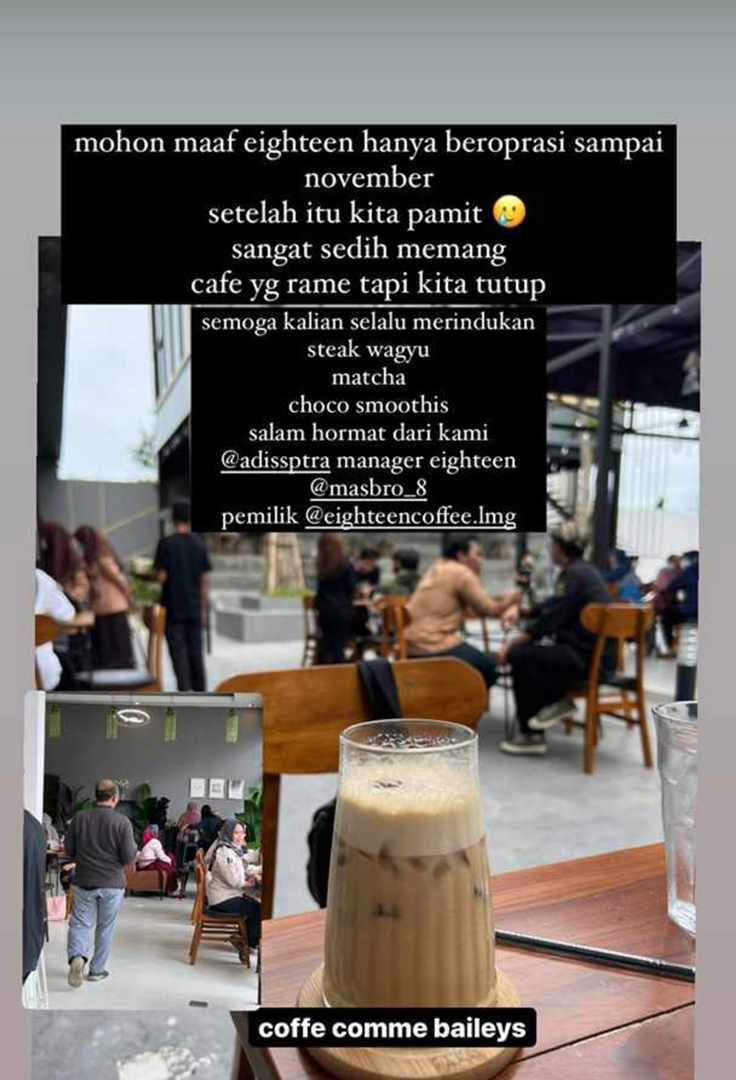 “Mohon maaf eighteen hanya beroperasi sampai November, Setelah itu kita pamit. Sangat sedih memang, Cafe yang rame tapi kita tutup,” cuitan di Instagram Story Eighteencoffe Lamongan beberapa waktu lalu yang bikin gempar jagad medsos.