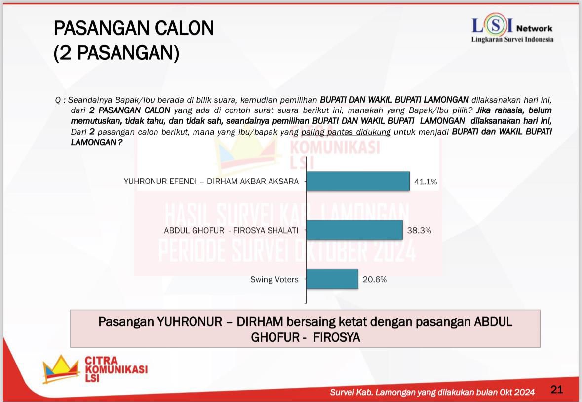 Lamongan,Aksesnusantara.id – Persaingan ketat di Pilkada Lamongan 2024 sudah terasa sejak awal Pendaftaran. Pasangan Calon Bupati dan Wakil Bupati Lamongan Bagus, Abdul Ghofur-Firosya Shalati dengan elektabilitas 38,3 persen berpotensi menyalip paslon Yuhronur Effendi-Dirham di Pilkada yang elektabilitasnya baru 41,1 persen, Hanya selisih kurang dari 3 persen dalam margin of error sebesar 3,5%, menunjukkan persaingan yang semakin ketat di Pilkada Kabupaten Lamongan, berdasarkan hasil Lingkaran Survei Indonesia (LSI) Network Denny JA.
