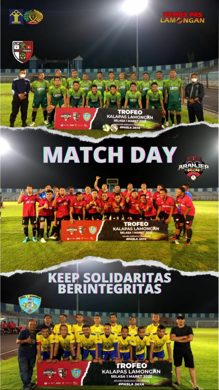 Aksesnusantara.id – Dalam rangka menjalin silahturahmi, Lembaga Pemasyarakatan (Lapas) Lamongan Kanwil Kemenkumham Jawa Timur menggelar pertandingan Sepak Bola memperebutkan Trofeo Kalapas Lamongan cup. Acara digelar di Stadion Surajaya Lamongan dengan mengundang Lapas Kelas I Surabaya (Latubaya Fc) dan Lapas Kelas I Malang (Aranjep Fc).