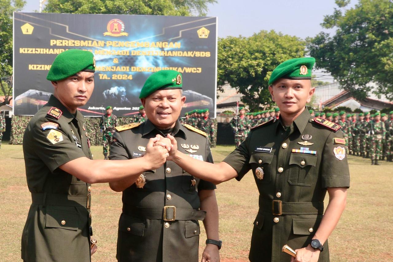 Jakarta – Kepala Pusat Zeni Angkatan Darat (Kapusziad) Mayjen TNI Budi Hariswanto, S.Sos., meresmikan Kizijihandak/SDS dan Kizinubika/WCJ menjadi Denzijihandak/SDS serta Denzinubika/WCJ di Asrama Jihandak Lenteng Agung, Jagakarsa, Jakarta Selatan, Rabu (14/8/2024).
