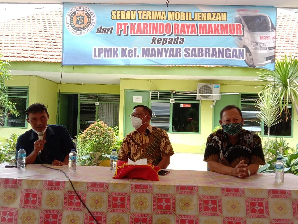 Untuk penyerahan mobil jenazah Dari PT. Karindo Raya Makmur diwakili Dwi Yanto dan diserahkan langsung ke ketua LPMK Manyar Sabrangan Drs Basuki Nugruho, M.Si, selanjutnya diserahkan ke Lurah Manyar Sabrangan mewakili warga.