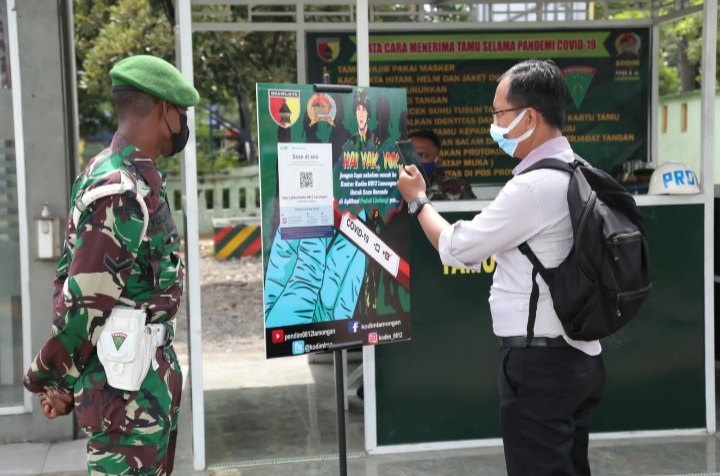 Gambar 1. Penggunaan aplikasi Peduli Lindungi di Kodim Lamongan.