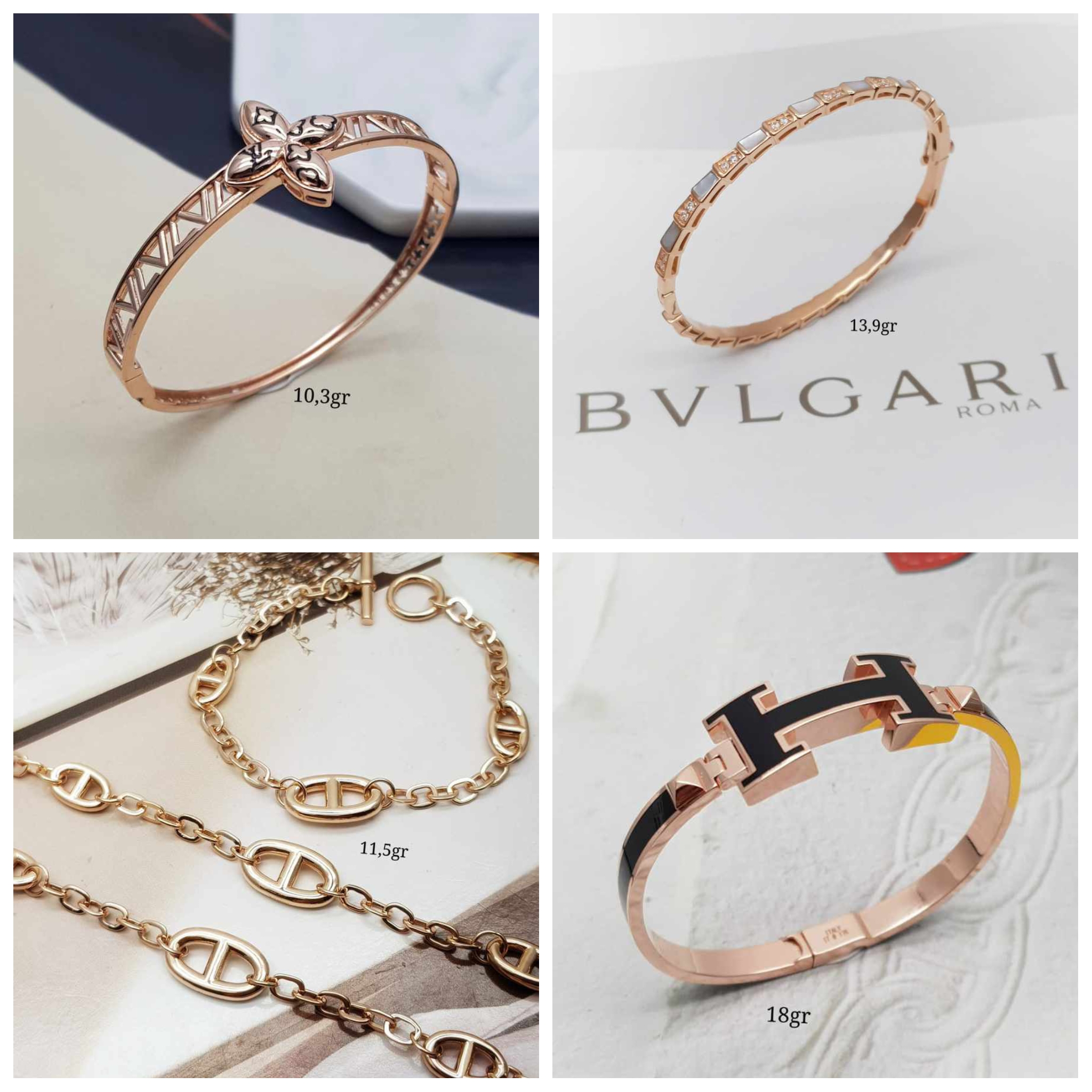 Perhiasan emas terakhir yang terkenal adalah Italian Bracelet. Perhiasan ini berbentuk gelang dengan logam 18 karat yang didesain dengan berbagai macam jenis warna mulai dari white gold, yellow gold, hingga rose gold.